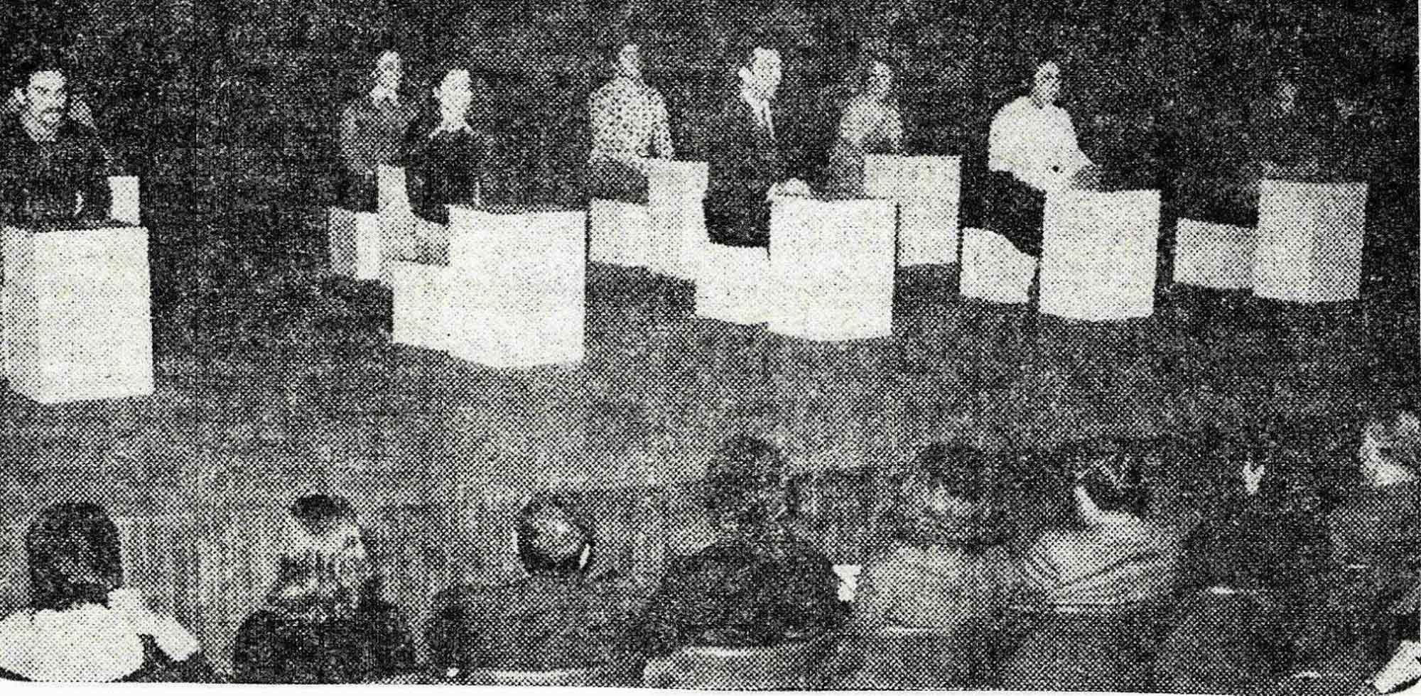 Ao fundo e ao centro, o Dr. Pizarro Beleza; ao fundo, à esquerda, eu e 3 companheiras do Grupo Teatro, 1972.